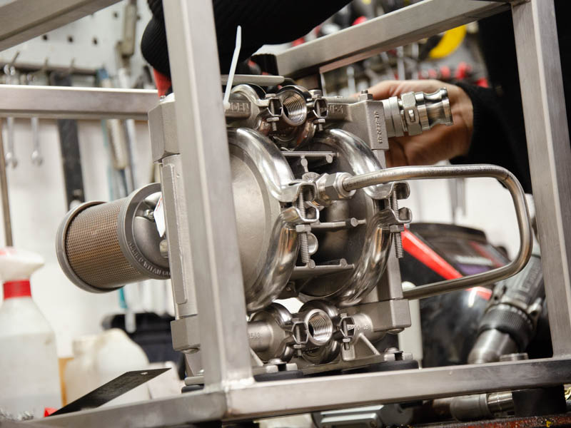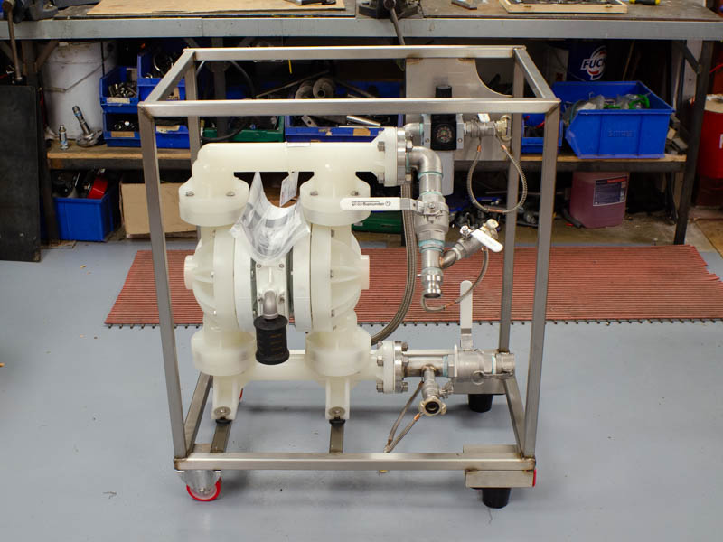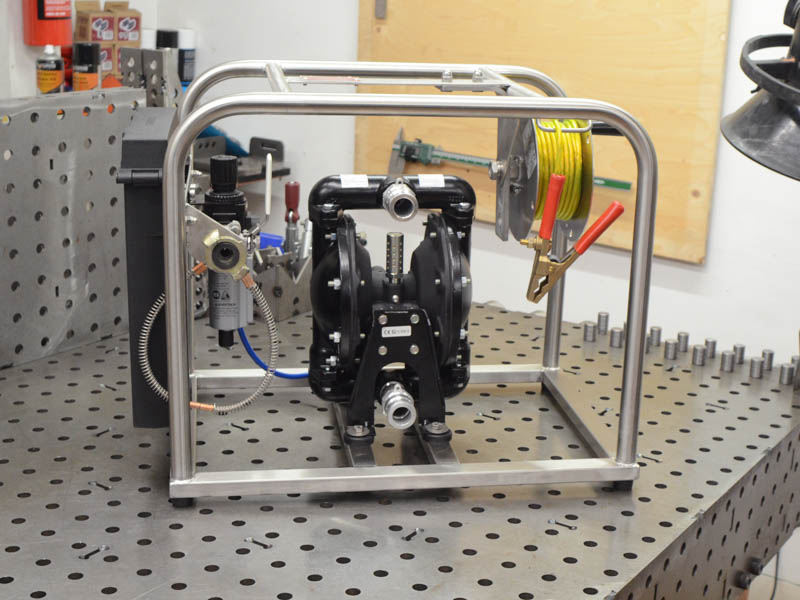 Pump carry cages made from stainless steel provide a robust, portable, and protective solution for diaphragm pumps. These cages are designed to shield the pump body from impacts, abrasions, and harsh working environments while still allowing full access to connections and controls. We fabricate our cages for diaphragm pumps up to 1", and can incorporate a range of features such as reinforced frames, integrated carrying handles, and wheeled varients that allow for easier portablility.